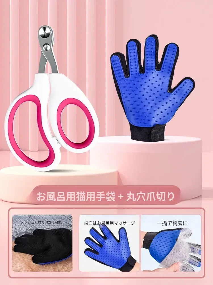 (ピンク版)丸穴爪切り+猫用入浴手袋