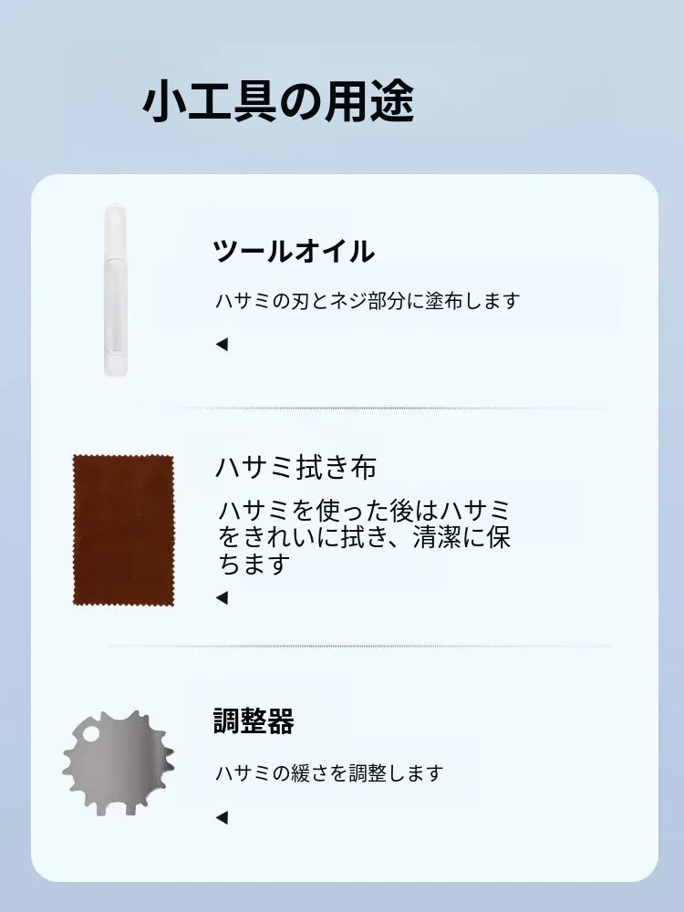 買うとプレゼント【収納バッグ、指サック、調整器、ケアオイル、ハサミ布】