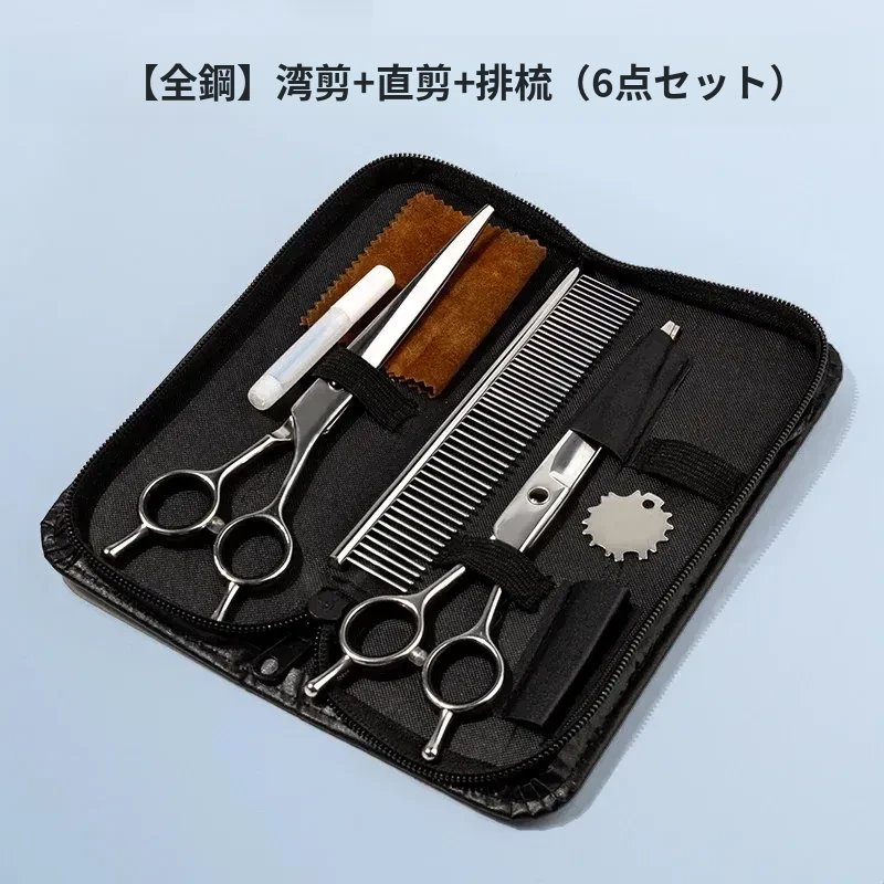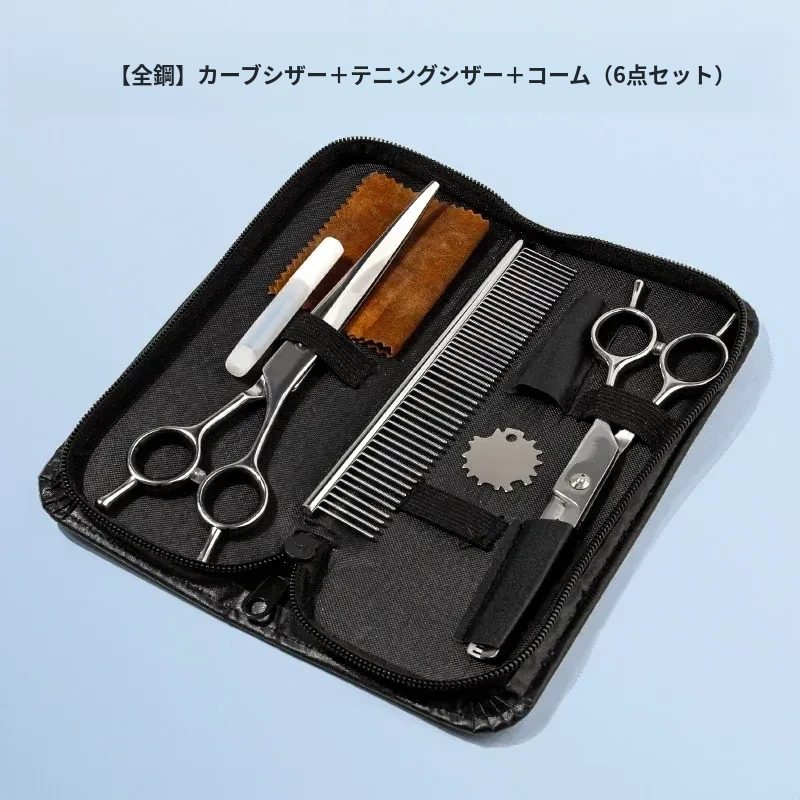 【全鋼】6点セット-カーブシザー+テザーシザー+コーム(はさみケース+布+メンテナンスオイル付き)