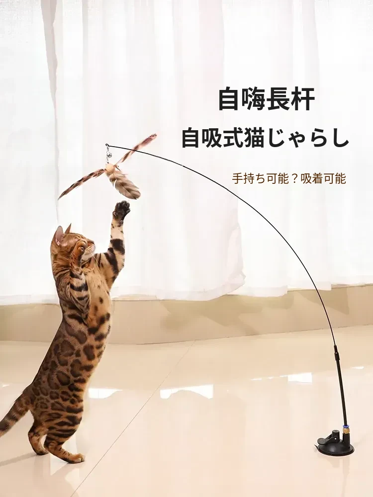 猫ちゃん大喜び!吸盤付き自動おもちゃ棒、羽根と鈴付きで、ネコの退屈を吹き飛ばす!噛んでも安心の耐久性。忙しいあなたにぴったりの楽しい遊び道具!猫も自分で遊べる、楽しいひとときを!